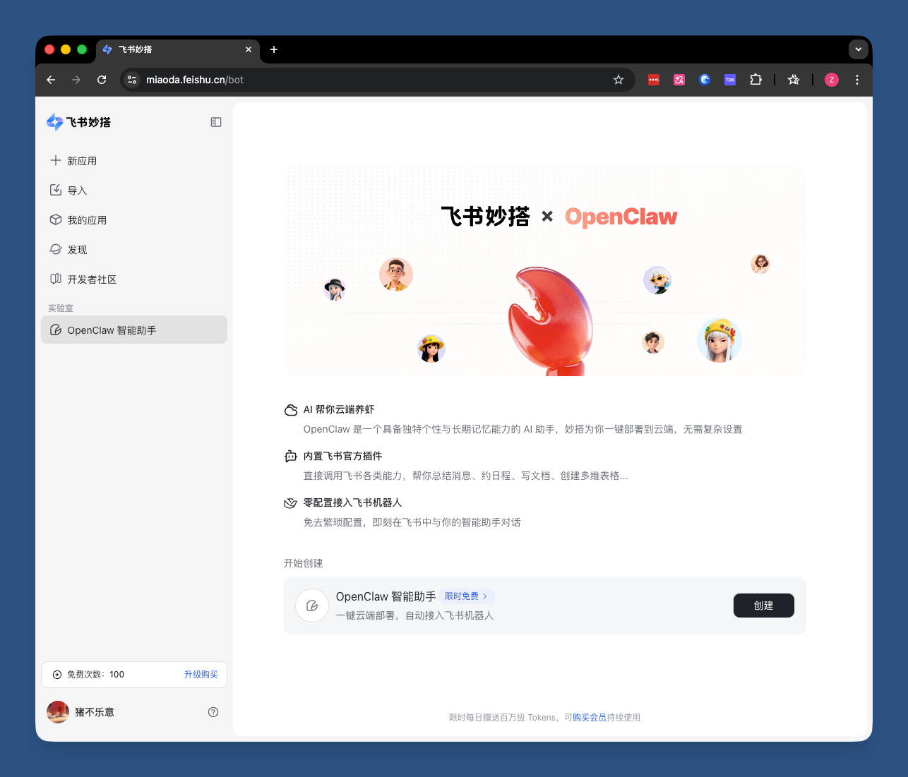 点击左侧边栏实验室中的 OpenClaw,即可进入搭建页面。每个用户可搭建一个龙虾机器人。