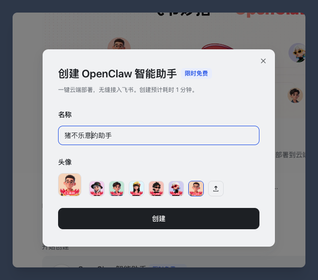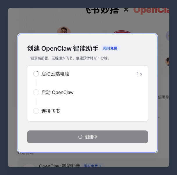 填入龙虾机器人的名字后继续点创建,你会发现它会自动进行安装、启动、并且自动连接飞书,全程无需人工干预。
