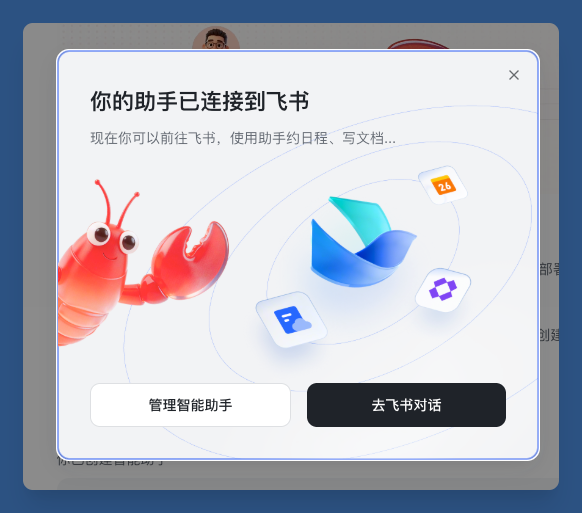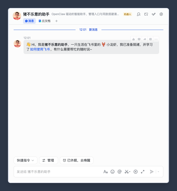 点击“去飞书对话”,就可以在飞书的聊天窗口,看到这个龙虾机器人了。