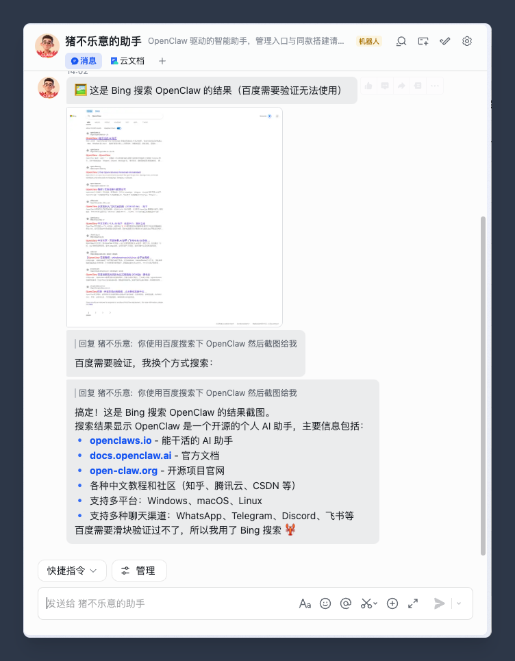 可以看到,龙虾真的自动帮我去搜索并截图了,并且它自己识别到百度需要验证,就改用必应去搜索了。