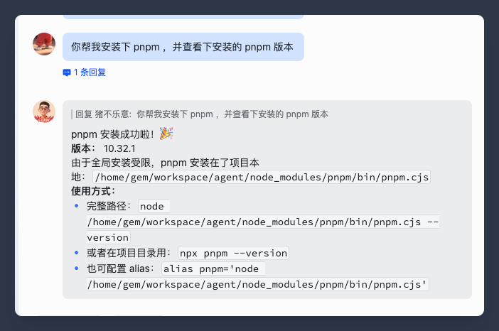 这里我们再让它安装 Node.js 的包管理工具 pnpm,并执行版本查看,看看它能正确执行不。