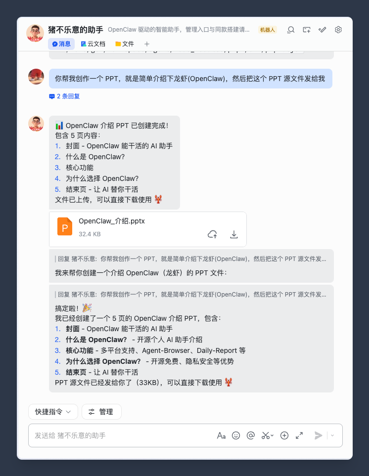 你帮我创作一个 PPT,就是简单介绍下龙虾(OpenClaw),然后把这个 PPT 源文件发给我