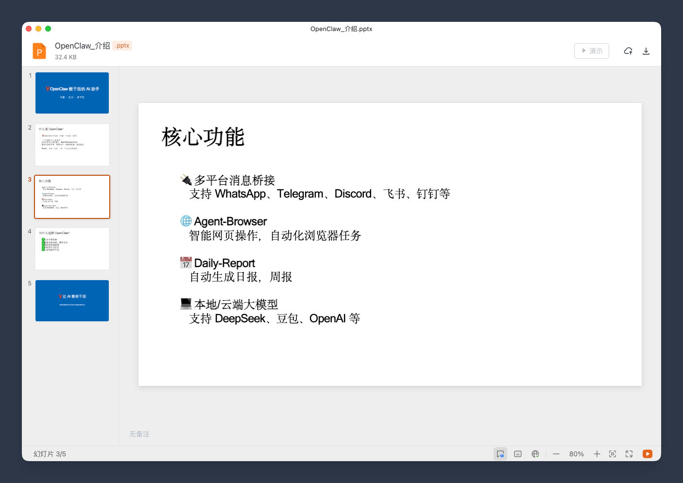 没过多久,龙虾就搞定了。我们打开它发来的 PPT,看看效果咋样。
