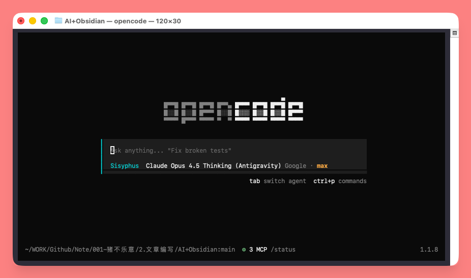 在 Obsidian 中使用 opencode 最无脑的就是直接进入到笔记目录启动命令行了