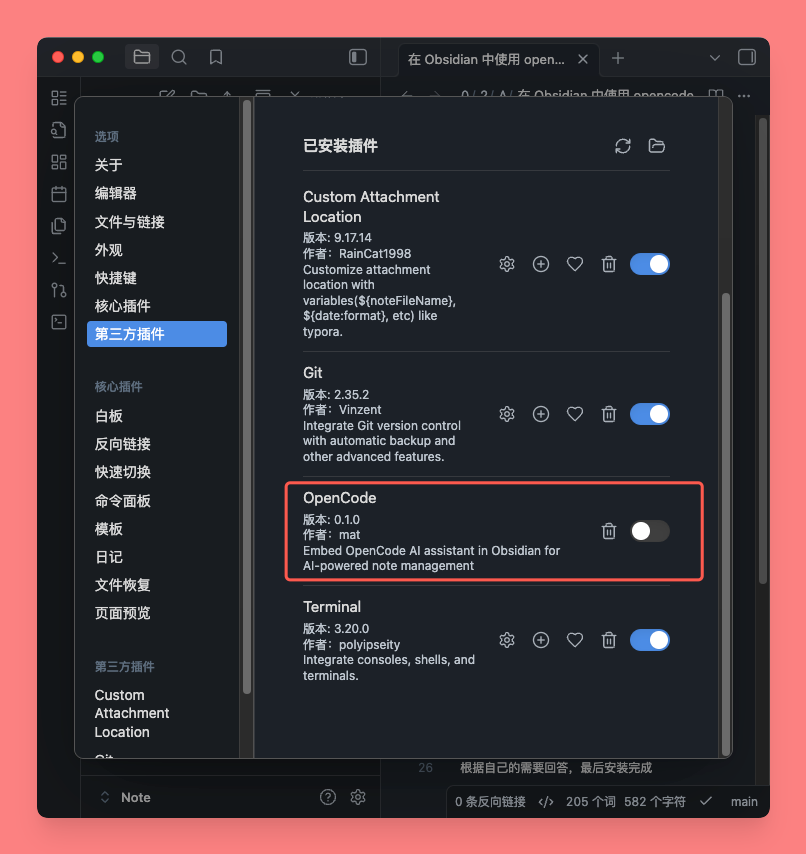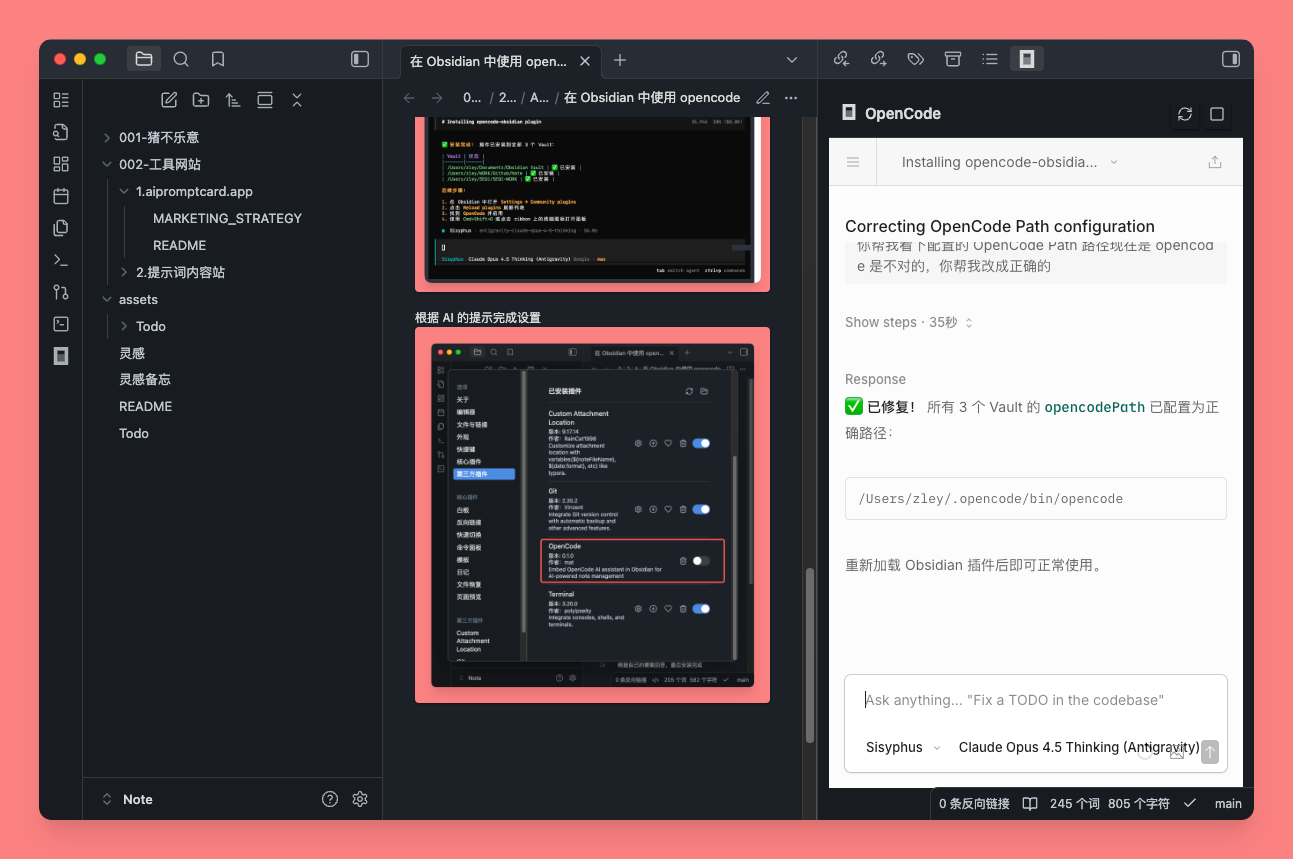 通过插件 OpenCode-Obsidian